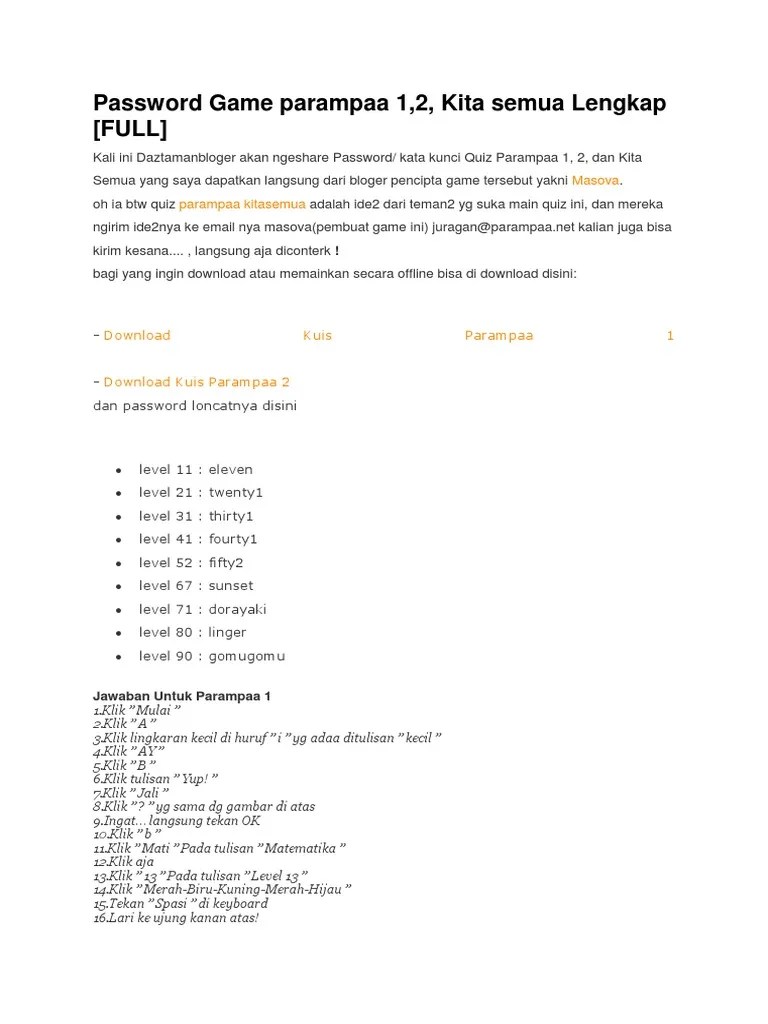 Kunci jawaban parampaa 1 dan 2 password jawaban parampaa 1 dan 2 jawaban kuis parampaa 1 dan 2 serta password level parampaa adalah kuis yang menguji otak kita untuk berpikir lebih keras karena jawabannya terkadang aneh dan tak terduga disini memberikan secara gratis jawaban lengkap quiz parampaa 1 dan 2. Jul 08, 2012 · hai gan, buat yang udah setres mikirin jawaban quiz parampaa. Jun 01, 2017 · jawaban & password quiz parampaa 1. Gomugomu clue parampaa 1 level 1 : Tahan klik kiri trus ke.