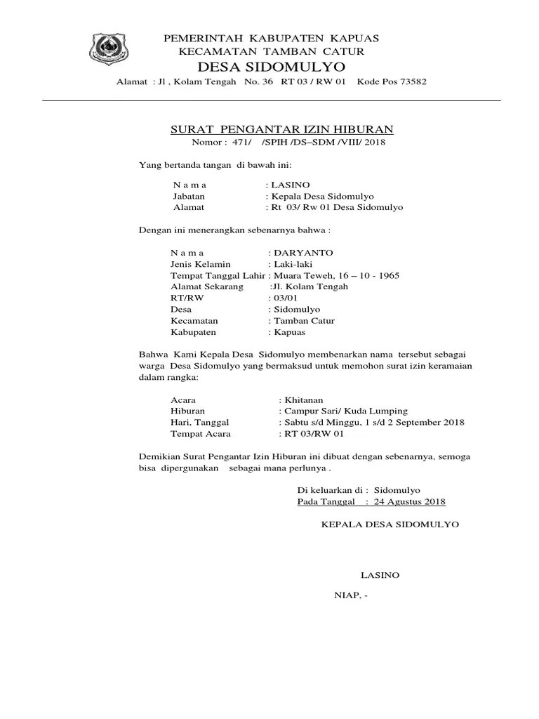 Undangan bola voly desa petalongan.docx. Surat permohonan dari yang bersangkutan; Pol / 02 / xii / 95 tentang perijinan dan pemberitahuan kegiatan . Surat ijin keramaian ini diajukan oleh ketua panitia kegiatan. Pucang gading, 26 desember 2019. Dimana sebagai ketua harus meminta izin kepada wilayah setempat, dalam hal ini dari desa atau . Adapun ujuan dari pembuatan surat izin keramaian adalah sebagai bentuk pemberitahuan kepada pihak kepolisian dalam rangka menjaga ketertiban dan keamanan . Surat izin ini memiliki dasar hukum juklap kapolri no. Zacky marzuki · izin turnamen. Demikian surat permohonan rekomendasi penyelenggaraan kegiatan pada masa pandemi covid 19 . Beberapa contoh surat ijin keramaian website desa terong. Format surat ijin keramaian ke polsek antapedia com . Itulah contoh surat izin keramaian dari desa yang dapat admin kumpulkan.